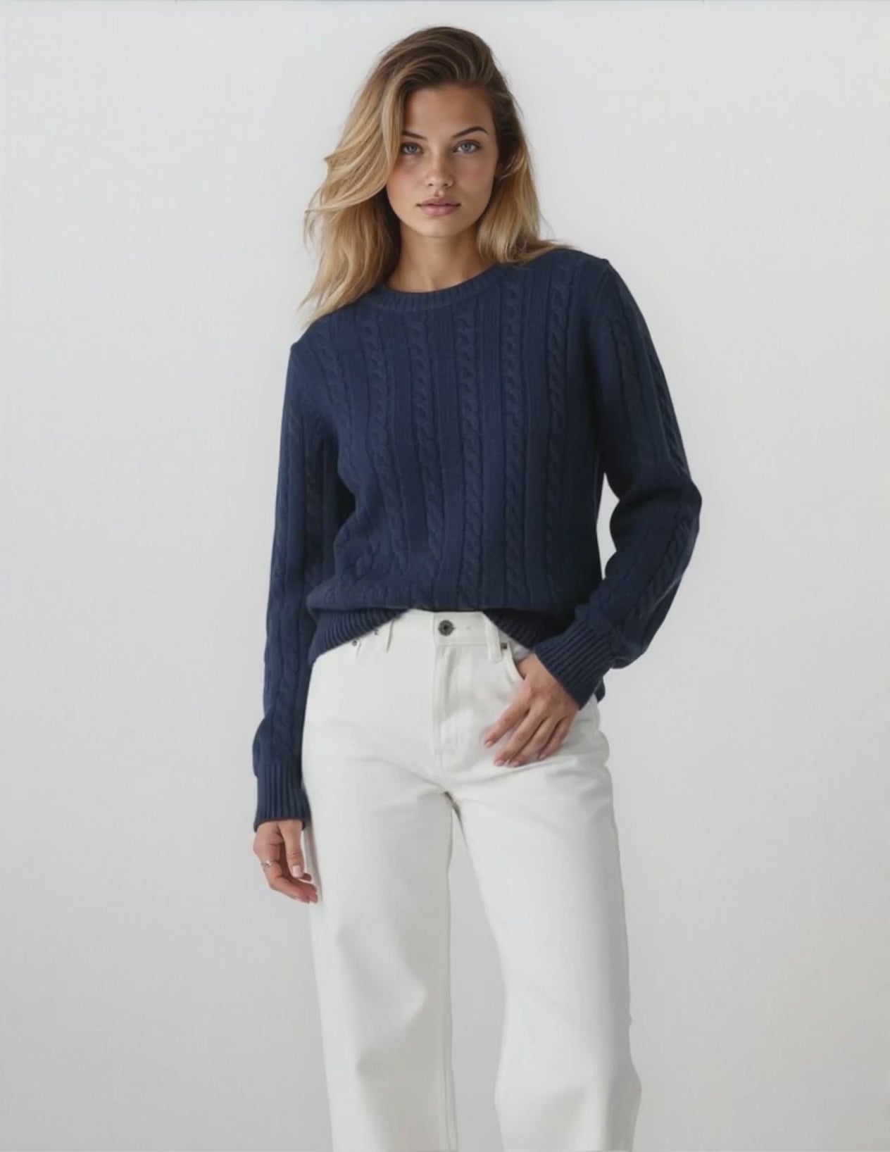 A classic cable-knit crewneck with everyday softness. The Clara sweater is knitted in a comfortable cotton-blend with a relaxed, easy fit and full-length sleeves—perfect for workdays, weekends and everything in between. Available in versatile solids: White, Black, Camel, Grey, Navy, Lake Blue. Sizes S–XXL.